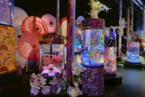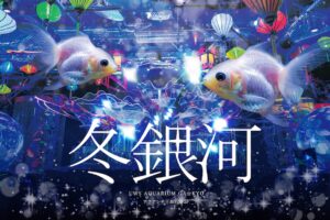 本展示は、“冬の夜空に浮かぶ天の川”をテーマにした冬季限 定展示です。雪や氷柱(つらら)、白と青の柔らかな光を組み 合わせ、入口からメインエリアまで館内全体を冬の銀河空間 として演出します。白を基調とした金魚が光の帯のなかを泳 ぐ姿に、冬の花材やオーナメントを添えることで、静けさと 美しさを併せ持つ幻想的な水中景観を表現。寒い季節ならで はのアクアリウムをお楽しみいただけます。